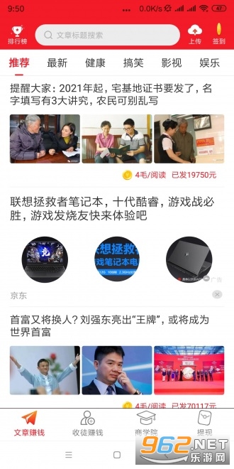乐看点APP是一个全新的手机转发文章赚钱软件,隶属于豆荚科技旗下所推出,软件于2026年12月14号上午9点45分正式发布上线!在软件上面为大家提供了健康、搞笑、影视等类型的新闻资讯,我们可以动动手把感兴趣的资讯转发分享出去,如果有好友打开并正常阅读那么就会得到乐看点发放的现金奖励,感兴趣朋友们快来下载试试吧!