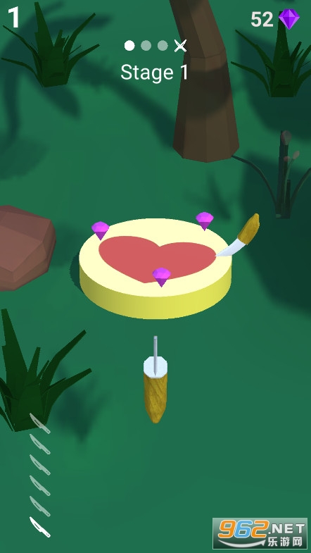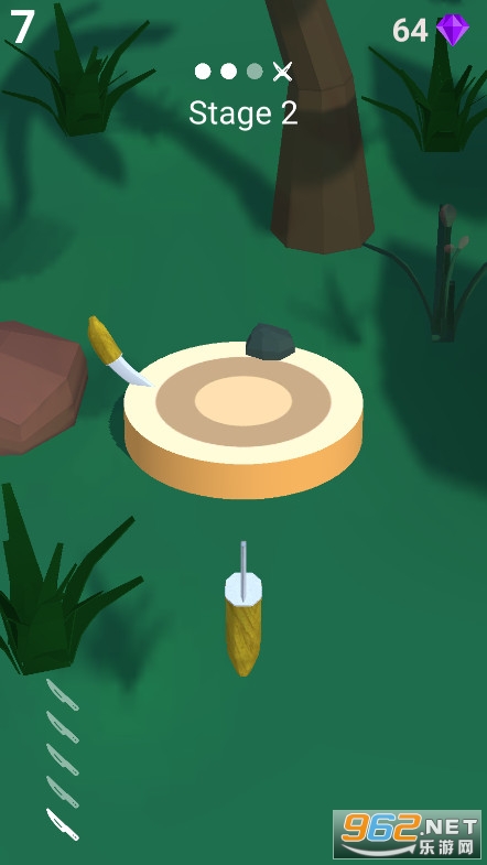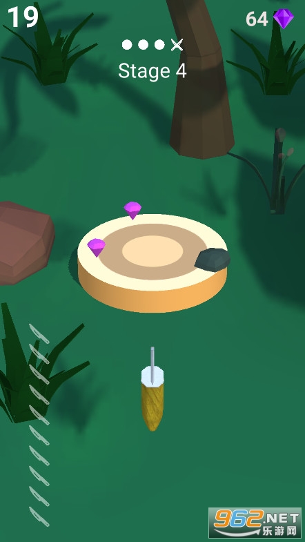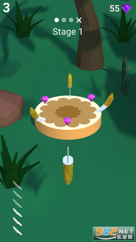 《野外飞刀安卓版》是一款飞刀投掷游戏,游戏的挑战难度略微有点大,你的飞刀靶子转动速度略快,一不小心你就可以回脱靶,或者是扎在了靶子上的石头上面,这些都会让你挑战失败,所以你要看准时机,将靶子扎碎,并且收集到钻石。