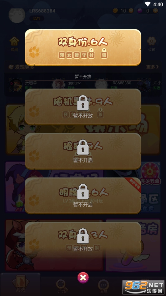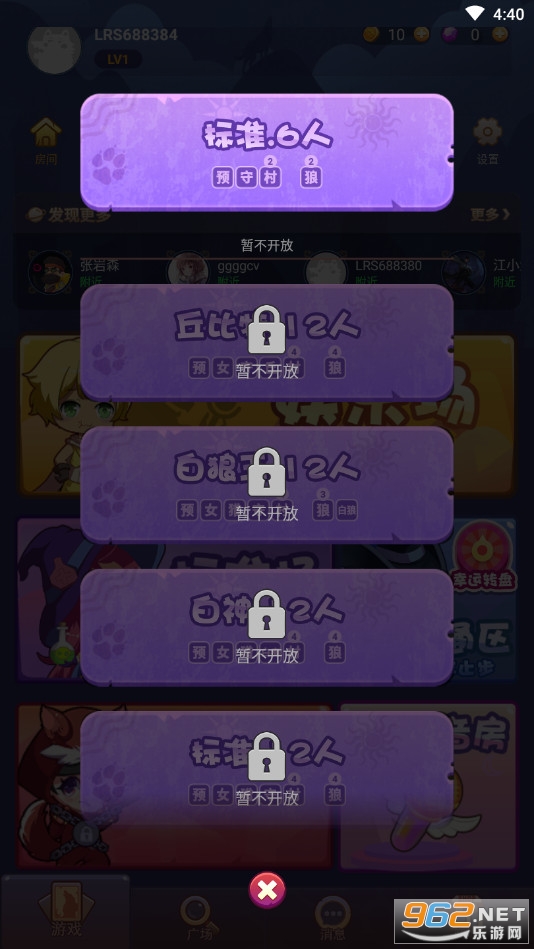 1、除了双身份狼人杀外,6人标准场、12人标准场、9人狼猎场、9人随机事件场等都能在开心狼人里体验。