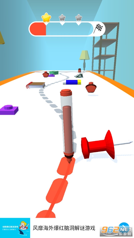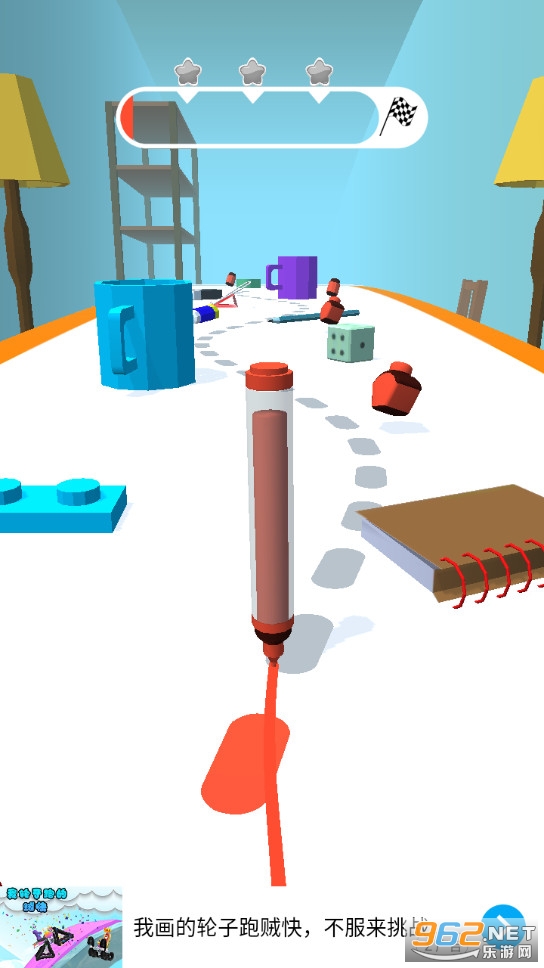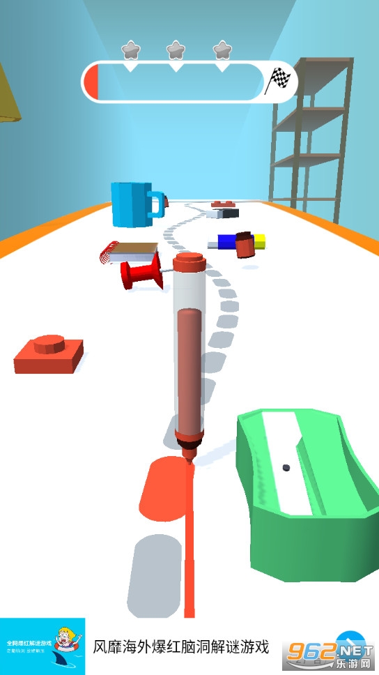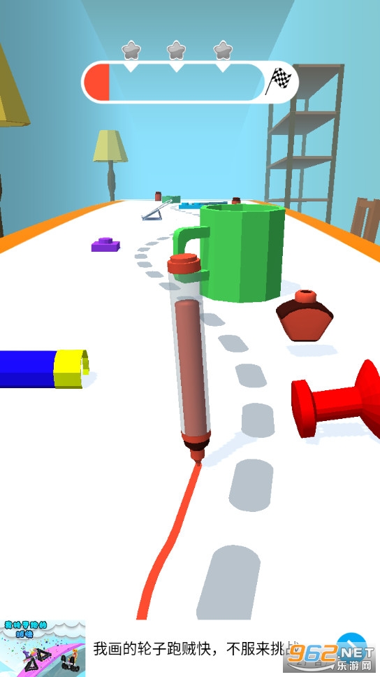 非常有趣的一款游戏,考验玩家的反应能力,玩家在游戏中控制着水彩笔向着终点走,尽量不偏离路线,但是也需要收集墨水,不然你是走不到最后的。