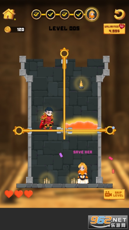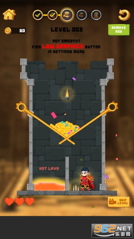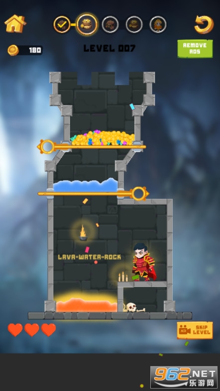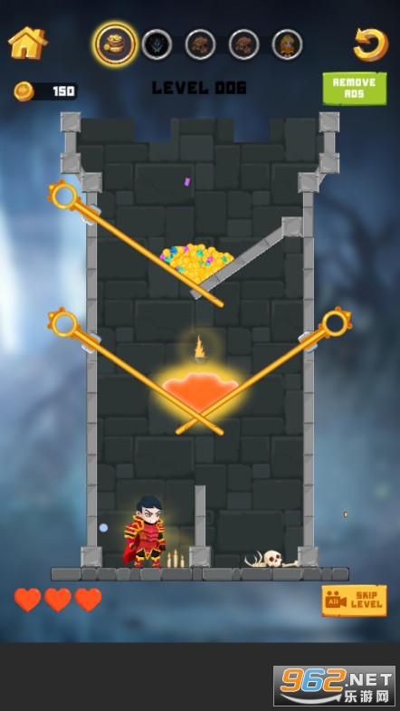 很简单的拉针玩法,玩起来不是很难,玩家要做的就是思考拉针的顺序,让勇者和公主避免岩浆的伤害,同时得到城堡里面的宝藏